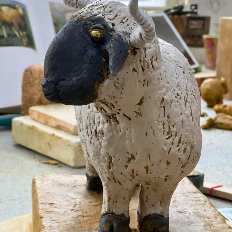 Die erste Aufgabe bestand darin, ein kleines Modell der Figur zu entwerfen, die wir später erschaffen wollten. Ich hatte ein Foto meines Schafes Tilly dabei, das als Vorlage dienen sollte. Mein erster Versuch, ihre Form in Ton zu fassen, war... nun ja, sagen wir, ein bescheidener Anfang. Seht selbst – da war noch Luft nach oben!
